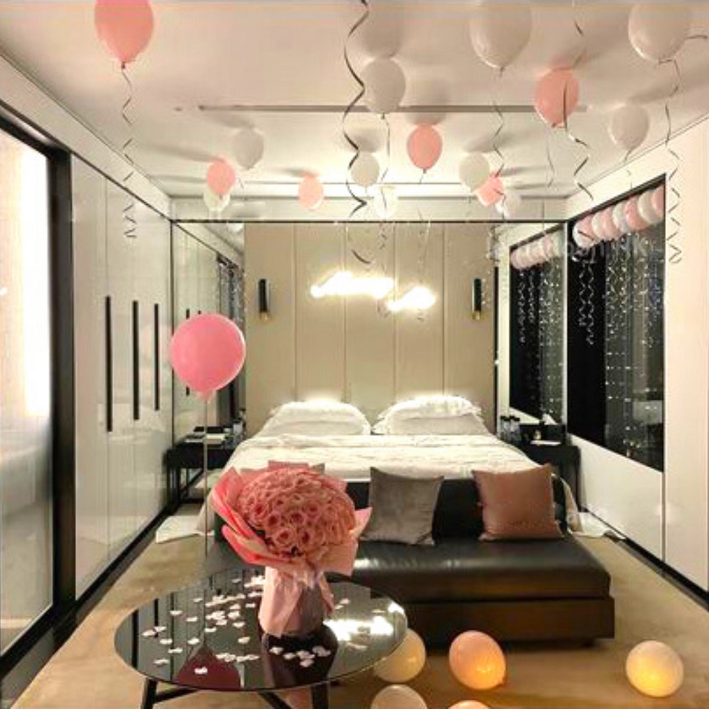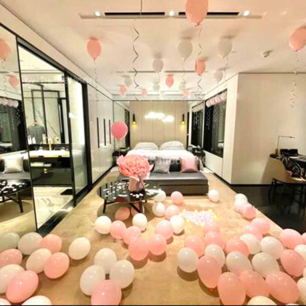 • In order to create the same experience as helium balloons, we fix air balloons to your ceiling with removable cello tape (normally no damage to the ceiling, but please remove it within 24 hours).